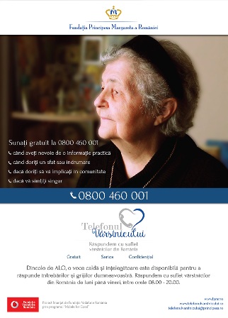 Telefonul Vârstnicului, linia telefonică gratuită şi confidenţială, operată de Fundația Principesa Margareta a României şi finanțată de Fundația Vodafone România prin programul Mobile for Good, răspunde nevoilor vârstnicilor din România, fie că vorbim de informare, consiliere, ori de sprijin emoţional. La numărul de telefon 0800 460 001, persoanele vârstnice primesc sfaturi şi sunt îndrumate de operatorii specializaţi în asistenţă socială ai Fundaţiei Principe